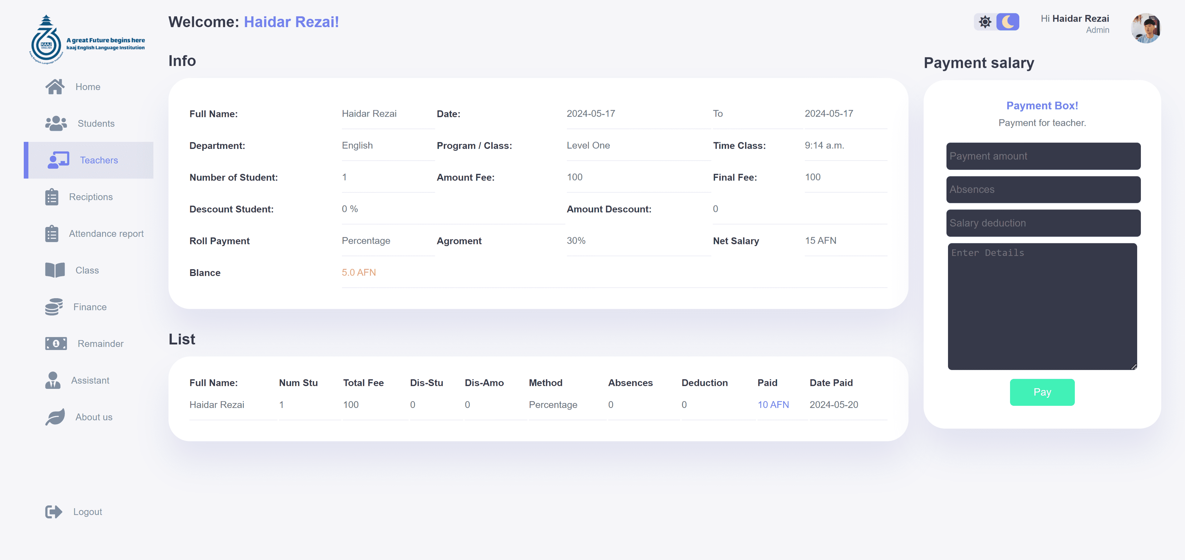 Salary Payments and Financial Reporting: Handle teacher salary payments and generate comprehensive financial reports.